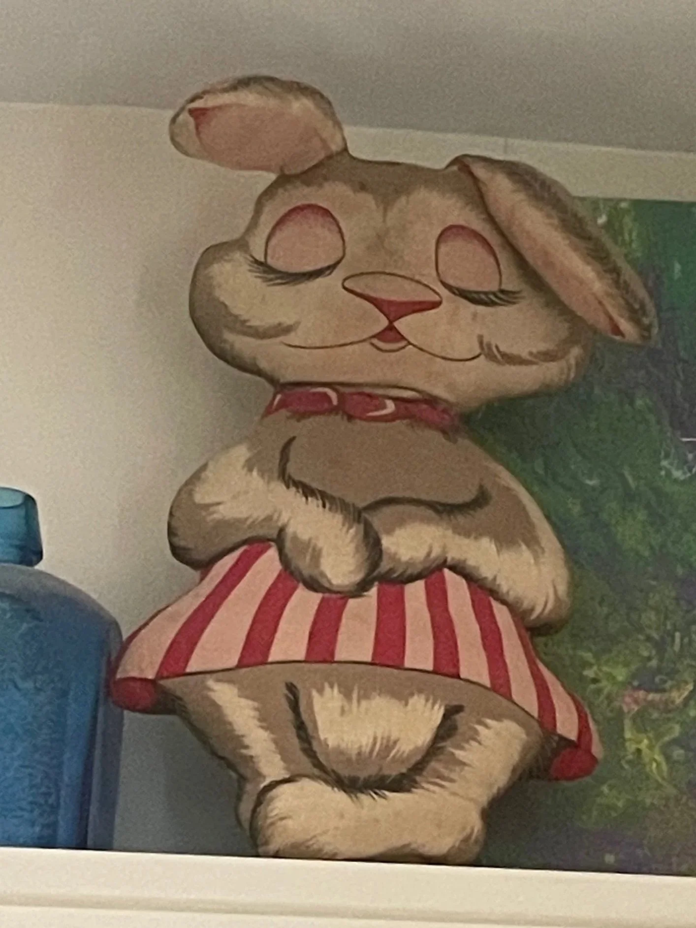 In my jewelry studio and office a printed stuffed rabbit sits high on a shelf looking over me. My Dad made her for me when I was 2 and he was in the hospital having half his stomach removed. He wanted me to have something to remember him by. She means the world to me. ( My Dad lived until I was 18 and I miss him dearly to this day.